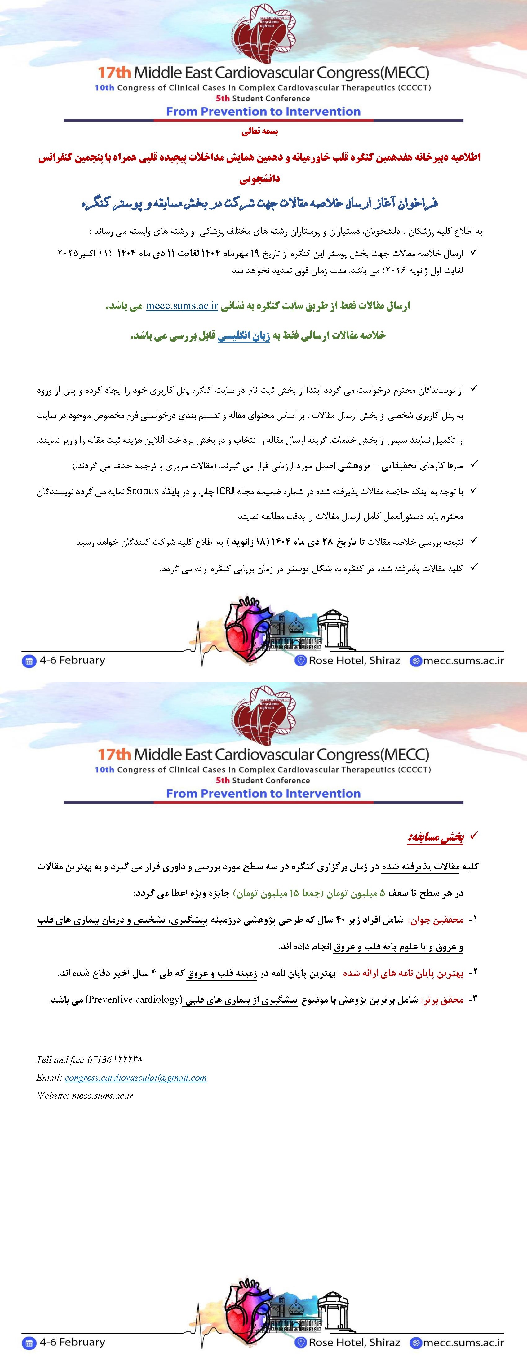 اطلاعیه بخش مسابقه هفدهمین کنگره قلب خاورمیانه و دهمین همایش مداخلات پیچیده قلبی همراه با پنجمین کنفرانس دانشجویی